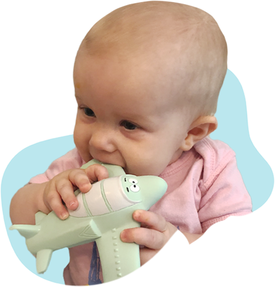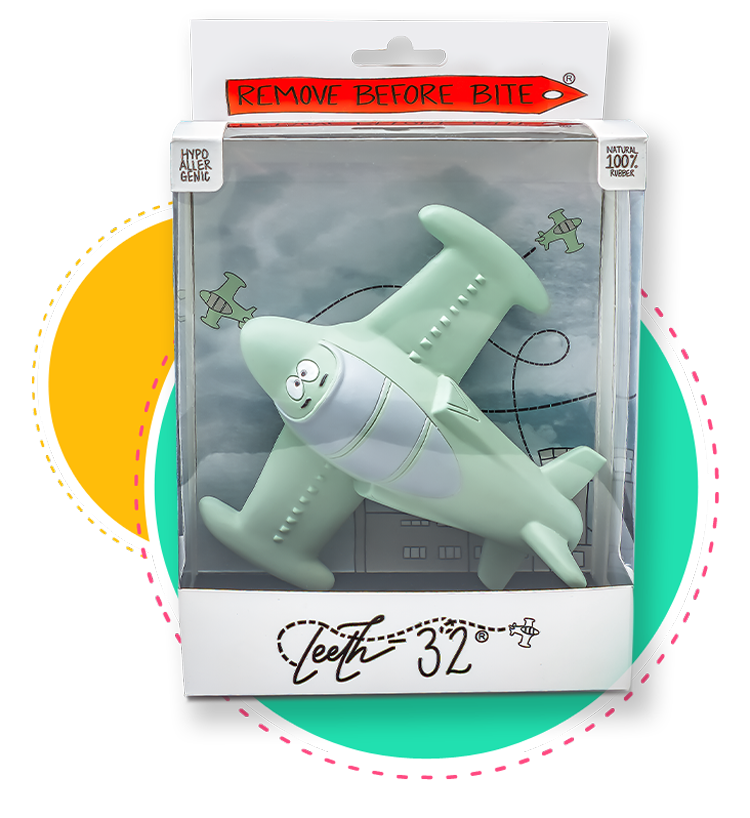Each Teeth-32 is made from 100% natural Havea rubber and is hypoallergenic. They are hand painted with non-toxic, food grade natural paints and easy to clean. The raised intakes above the wing give added texture while the nose and tail are sure to be your child’s favorite!